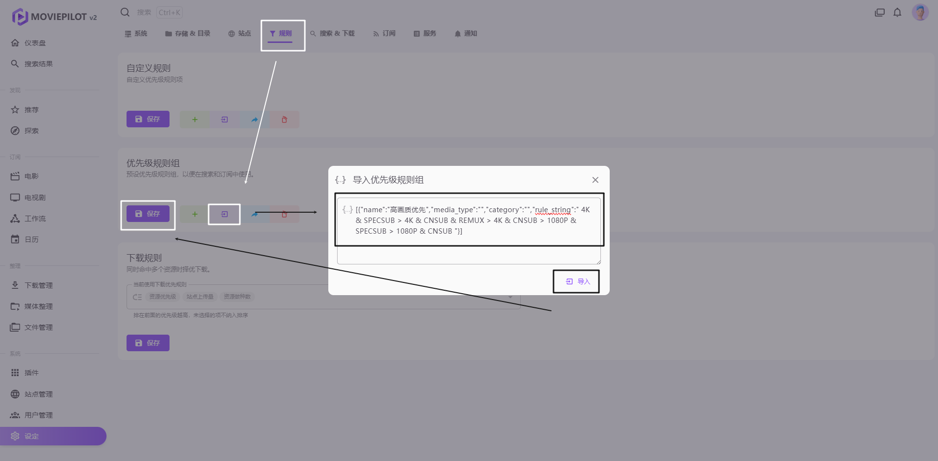 [{"name":"高画质优先","media_type":"","category":"","rule_string":" 4K & SPECSUB > 4K & CNSUB & REMUX > 4K & CNSUB > 1080P & SPECSUB > 1080P & CNSUB "}]